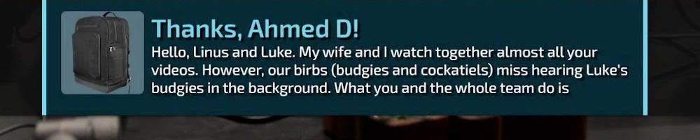 Hello, Linus and Luke. My wife and I watch together almost all your videos. However, our birds (budgies and cockatiels) miss hearing Luke's budgies in the background. What you and the whole team do is