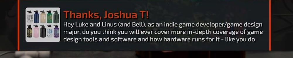 Hey Luke and Linus (and Bell), as an indie game developer/game design major, do you think you will ever cover more in-depth coverage of game design tools and software and how hardware runs for it - like you do