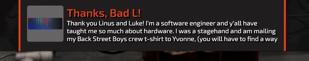 Thank you Linus and Luke! I'm a software engineer and y'all have taught me so much about hardware. I was a stagehand and am mailing my Back Street Boys crew t-shirt to Yvonne, (you will have to find a way