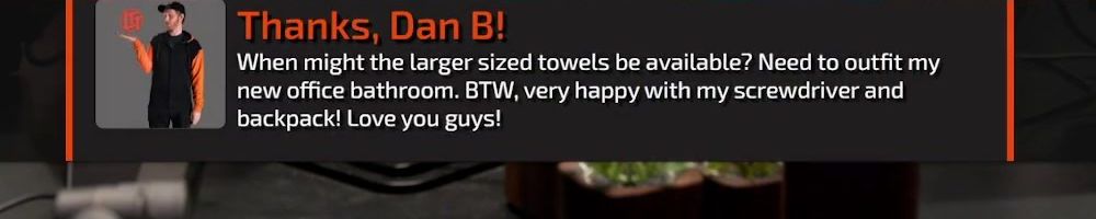 When might the larger sized towels be available? Need to outfit my new office bathroom. BTW, very happy with my screwdriver and backpack! Love you guys!