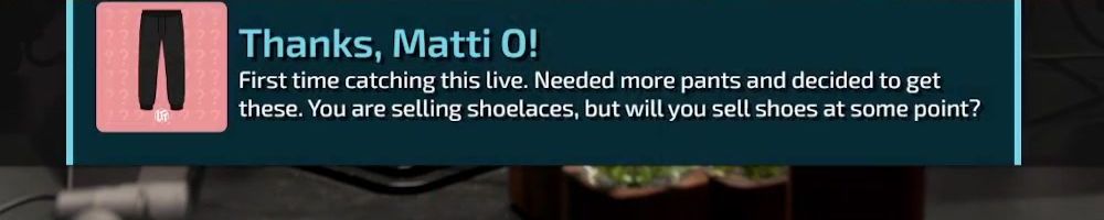 First time catching this live. Needed more pants and decided to get these. You are selling shoelaces, but will you sell shoes at some point?