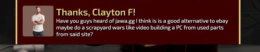 Have you guys heard of jawa.gg I think is is a good alternative to ebay maybe do a scrapyard wars like video building a PC from used parts from said site?