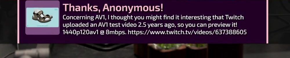 Concerning AV1, I thought you might find it interesting that Twitch uploaded an AV1 test video 2.5 years ago, so you can preview it! 1440p120av1 @ 8mbps. https://www.twitch.tv/videos/637388605