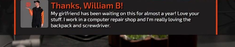 My girlfriend has been waiting on this for almost a year! Love your stuff. I work in a computer repair shop and I'm really loving the backpack and screwdriver.