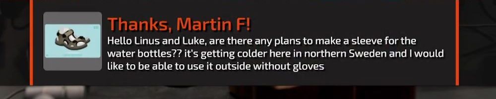 Hello Linus and Luke, are there any plans to make a sleeve for the water bottles?? it's getting colder here in northern Sweden and I would like to be able to use it outside without gloves