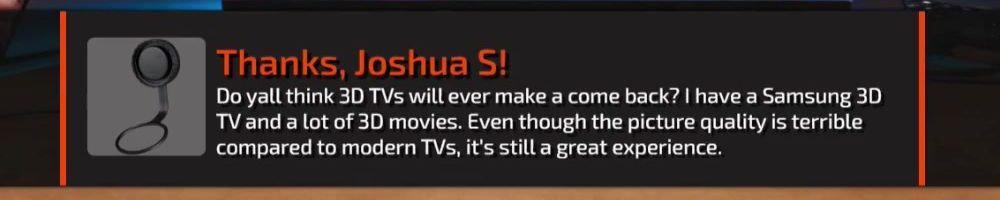 Do yall think 3D TVs will ever make a come back? I have a Samsung 3D TV and a lot of 3D movies. Even though the picture quality is terrible compared to modern TVs, it's still a great experience.