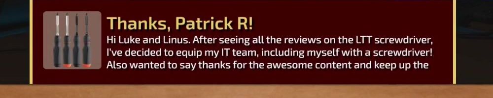 Hi Luke and Linus. After seeing all the reviews on the LTT screwdriver, I've decided to equip my IT team, including myself with a screwdriver! Also wanted to say thanks for the awesome content and keep up the