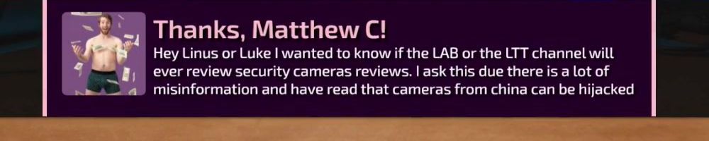 Hey Linus or Luke I wanted to know if the LAB or the LTT channel will ever review security cameras reviews. I ask this due there is a lot of misinformation and have read that cameras from china can be hijacked