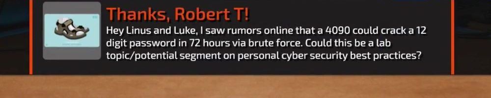 Hey Linus and Luke, I saw rumors online that a 4090 could crack a 12 digit password in 72 hours via brute force. Could this be a lab topic/potential segment on personal cyber security best practices?