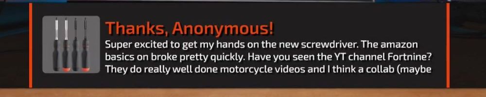 Super excited to get my hands on the new screwdriver. The amazon basics on broke pretty quickly. Have you seen the YT channel Fortnine? They do really well done motorcycle videos and I think a collab (maybe