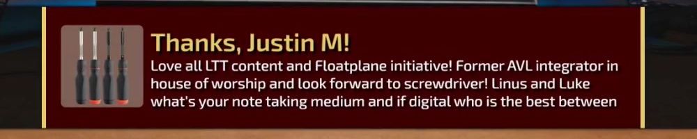 Love all LTT content and Floatplane initiative! Former AVL integrator in house of worship and look forward to screwdriver! Linus and Luke what's your note taking medium and if digital who is the best between