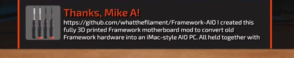 https://github.com/whatthefilament/Framework-AIO I created this fully 3D printed Framework motherboard mod to convert old Framework hardware into an iMac-style AIO PC. All held together with