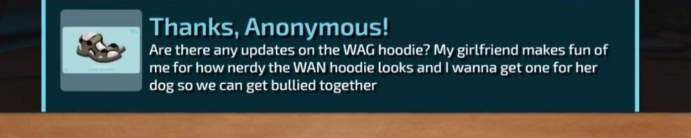 Are there any updates on the WAG hoodie? My girlfriend makes fun of me for how nerdy the WAN hoodie looks and I wanna get one for her dog so we can get bullied together