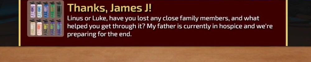 Linus or Luke, have you lost any close family members, and what helped you get through it? My father is currently in hospice and we're preparing for the end.