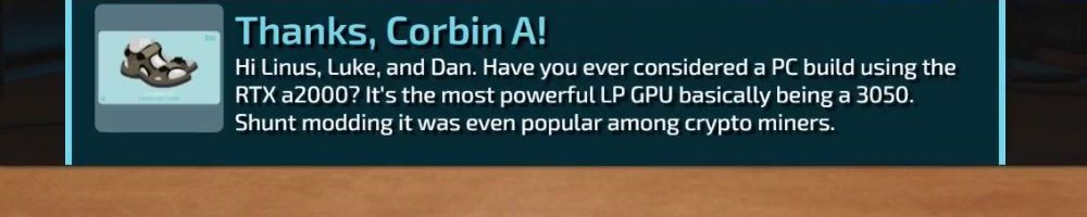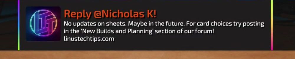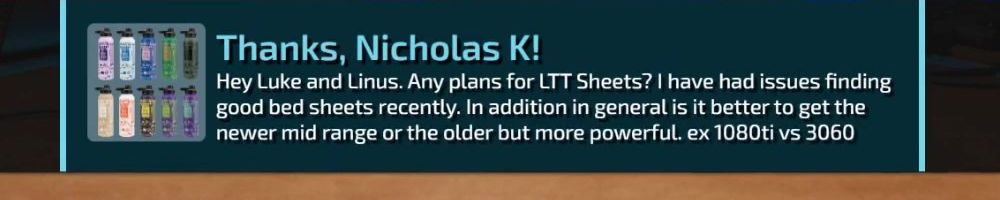 Hey Luke and Linus. Any plans for LTT Sheets? I have had issues finding good bed sheets recently. In addition in general is it better to get the newer mid range or the older but more powerful. ex 1080ti vs 3060