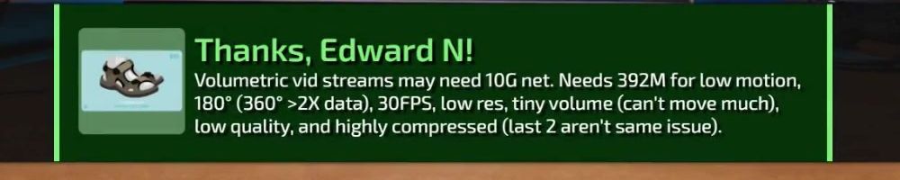 Volumetric vid streams may need 10G net. Needs 392M for low motion, 180° (360° >2X data), 30FPS, low res, tiny volume (can't move much), low quality, and highly compressed (last 2 aren't same issue).