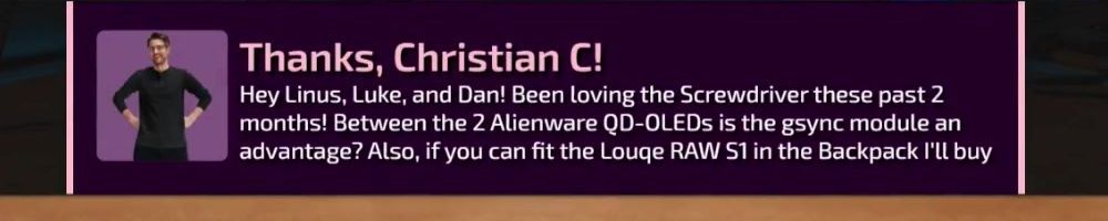 Hey Linus, Luke, and Dan! Been loving the Screwdriver these past 2 months! Between the 2 Alienware QD-OLEDs is the gsync module an advantage? Also, if you can fit the Louge RAW S1 in the Backpack I'll buy