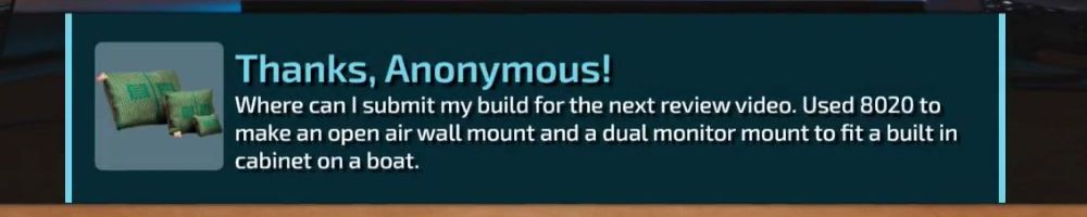 Where can I submit my build for the next review video. Used 8020 to make an open air wall mount and a dual monitor mount to fit a built in cabinet on a boat.