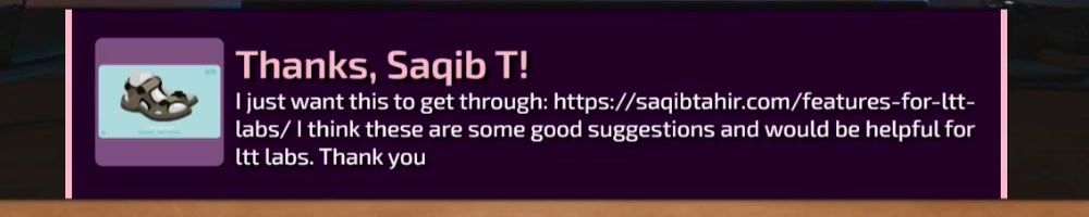 I just want this to get through: https://sagibtahir.com/features-for-ltt-labs/ I think these are some good suggestions and would be helpful for ltt labs. Thank you