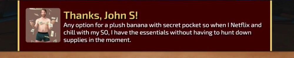 Any option for a plush banana with secret pocket so when I Netflix and chill with my SO, I have the essentials without having to hunt down supplies in the moment.