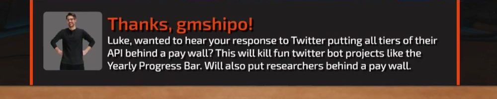 Luke, wanted to hear your response to Twitter putting all tiers of their API behind a pay wall? This will kill fun twitter bot projects like the Yearly Progress Bar. Will also put researchers behind a pay wall.