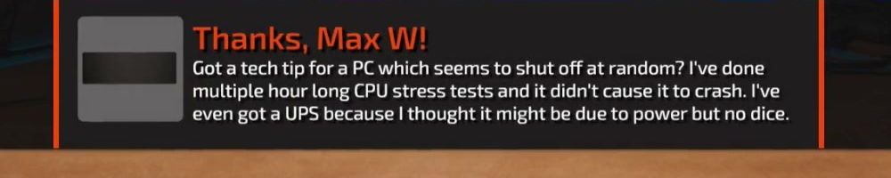Got a tech tip for a PC which seems to shut off at random? I've done multiple hour long CPU stress tests and it didn't cause it to crash. I've even got a UPS because I thought it might be due to power but no dice.