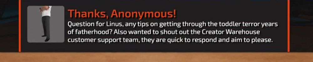 Question for Linus, any tips on getting through the toddler terror years of fatherhood? Also wanted to shout out the Creator Warehouse customer support team, they are quick to respond and aim to please.