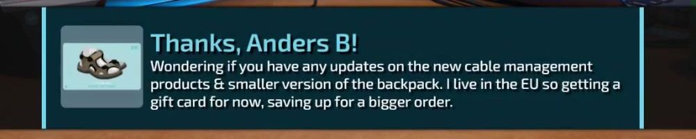 Wondering if you have any updates on the new cable management products & smaller version of the backpack. I live in the EU so getting a gift card for now, saving up for a bigger order.