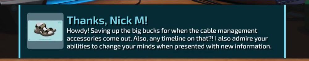 Howdy! Saving up the big bucks for when the cable management accessories come out. Also, any timeline on that?! I also admire your abilities to change your minds when presented with new information.