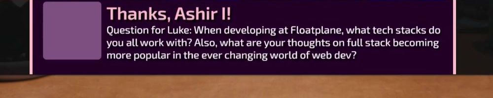 Question for Luke: When developing at Floatplane, what tech stacks do you all work with? Also, what are your thoughts on full stack becoming more popular in the ever changing world of web dev?