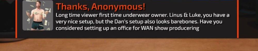 Long time viewer first time underwear owner. Linus & Luke, you have a very nice setup, but the Dan's setup also looks barebones. Have you considered setting up an office for WAN show producering