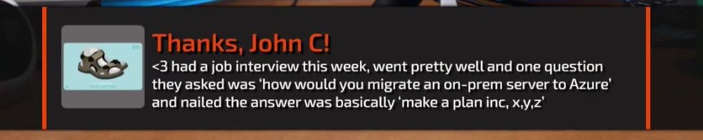 <3 had a job interview this week, went pretty well and one question they asked was 'how would you migrate an on-prem server to Azure' and nailed the answer was basically 'make a plan inc, x,y,z'