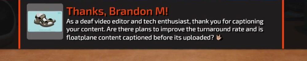 As a deaf video editor and tech enthusiast, thank you for captioning your content. Are there plans to improve the turnaround rate and is floatplane content captioned before it's uploaded? 🖐️
