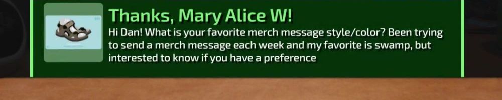 Hi Dan! What is your favorite merch message style/color? Been trying to send a merch message each week and my favorite is swamp, but interested to know if you have a preference