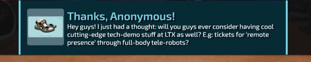 Hey guys! I just had a thought: will you guys ever consider having cool cutting-edge tech-demo stuff at LTX as well? E.g: tickets for 'remote presence' through full-body tele-robots?