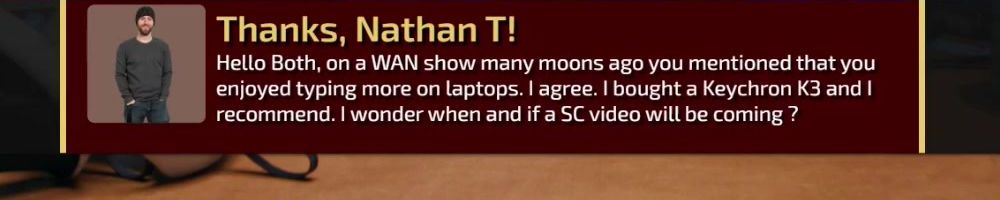 Hello Both, on a WAN show many moons ago you mentioned that you enjoyed typing more on laptops. I agree. I bought a Keychron K3 and I recommend. I wonder when and if a SC video will be coming ?
