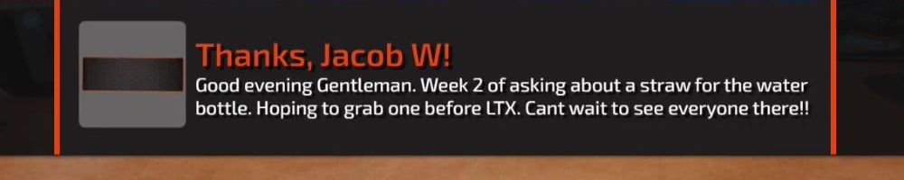 Good evening Gentleman. Week 2 of asking about a straw for the water bottle. Hoping to grab one before LTX. Cant wait to see everyone there!!