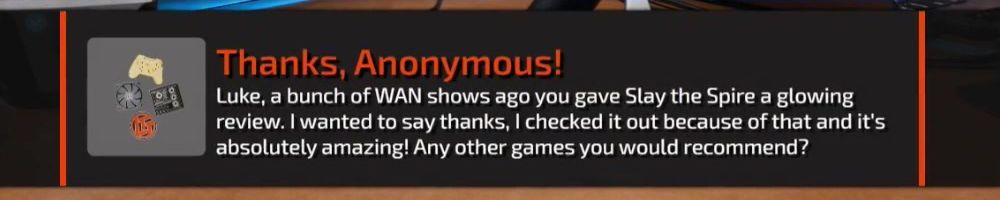 Luke, a bunch of WAN shows ago you gave Slay the Spire a glowing review. I wanted to say thanks, I checked it out because of that and it's absolutely amazing! Any other games you would recommend?