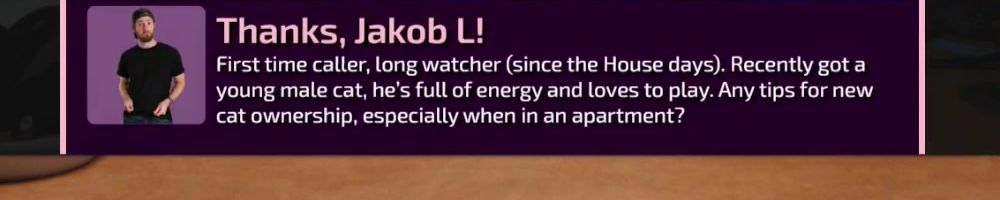 First time caller, long watcher (since the House days). Recently got a young male cat, he's full of energy and loves to play. Any tips for new cat ownership, especially when in an apartment?