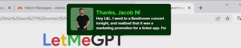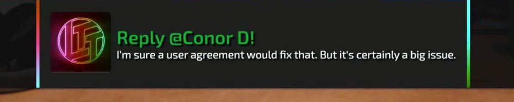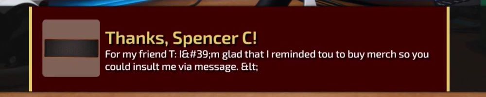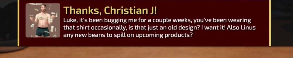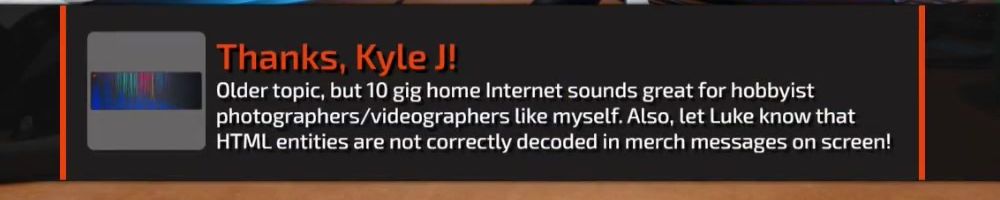 Older topic, but 10 gig home Internet sounds great for hobbyist photographers/videographers like myself. Also, let Luke know that HTML entities are not correctly decoded in merch messages on screen!