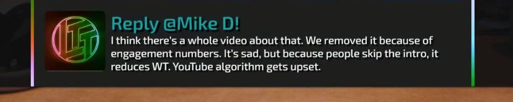 I think there's a whole video about that. We removed it because of engagement numbers. It's sad, but because people skip the intro, it reduces WT. YouTube algorithm gets upset.