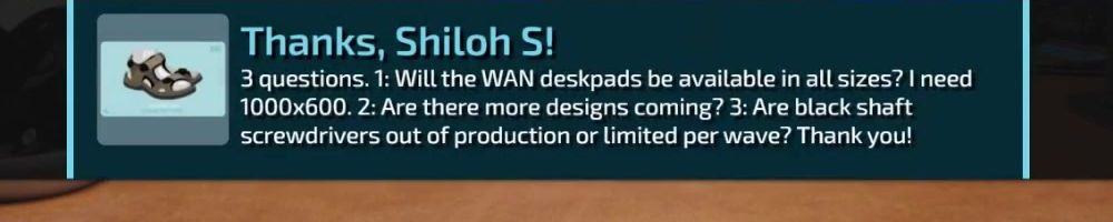 3 questions. 1: Will the WAN deskpads be available in all sizes? I need 1000x600. 2: Are there more designs coming? 3: Are black shaft screwdrivers out of production or limited per wave? Thank you!