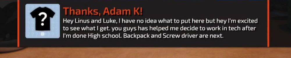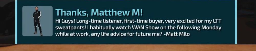 Hi Guys! Long-time listener, first-time buyer, very excited for my LTT sweatpants! I habitually watch WAN Show on the following Monday while at work, any life advice for future me? -Matt Milo