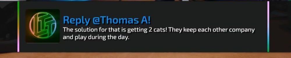 Routines are extremely important. Sometimes if you're out for long periods of time, a second cat can make ownership easier. But then, now you have two cats.
