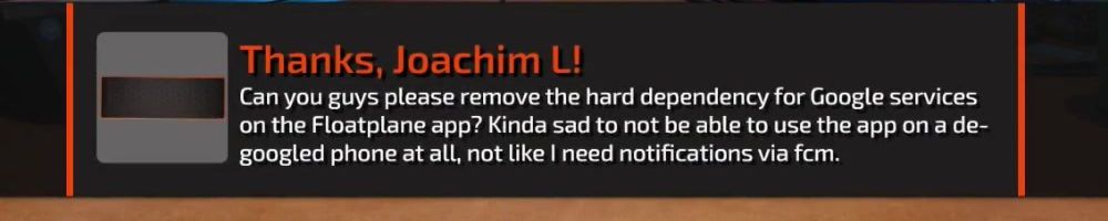 Can you guys please remove the hard dependency for Google services on the Floatplane app? Kinda sad to not be able to use the app on a de-googled phone at all, not like I need notifications via fcm.