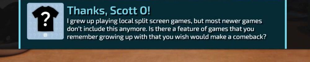I grew up playing local split screen games, but most newer games don't include this anymore. Is there a feature of games that you remember growing up with that you wish would make a comeback?