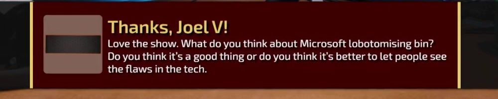 Love the show. What do you think about Microsoft lobotomising bin? Do you think it's a good thing or do you think it's better to let people see the flaws in the tech.