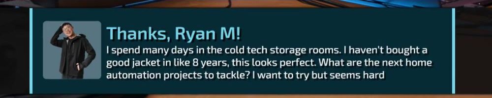 I spend many days in the cold tech storage rooms. I haven't bought a good jacket in like 8 years, this looks perfect. What are the next home automation projects to tackle? I want to try but seems hard