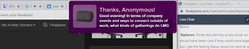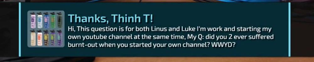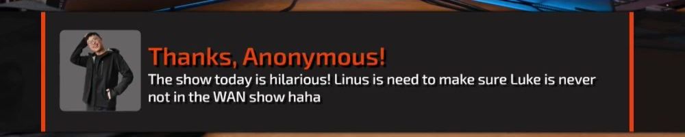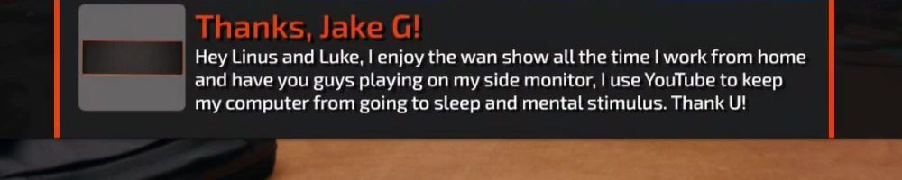 Hey Linus and Luke, I enjoy the wan show all the time I work from home and have you guys playing on my side monitor, I use YouTube to keep my computer from going to sleep and mental stimulus. Thank U!