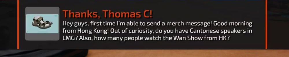 Hey guys, first time I'm able to send a merch message! Good morning from Hong Kong! Out of curiosity, do you have Cantonese speakers in LMG? Also, how many people watch the Wan Show from HK?
